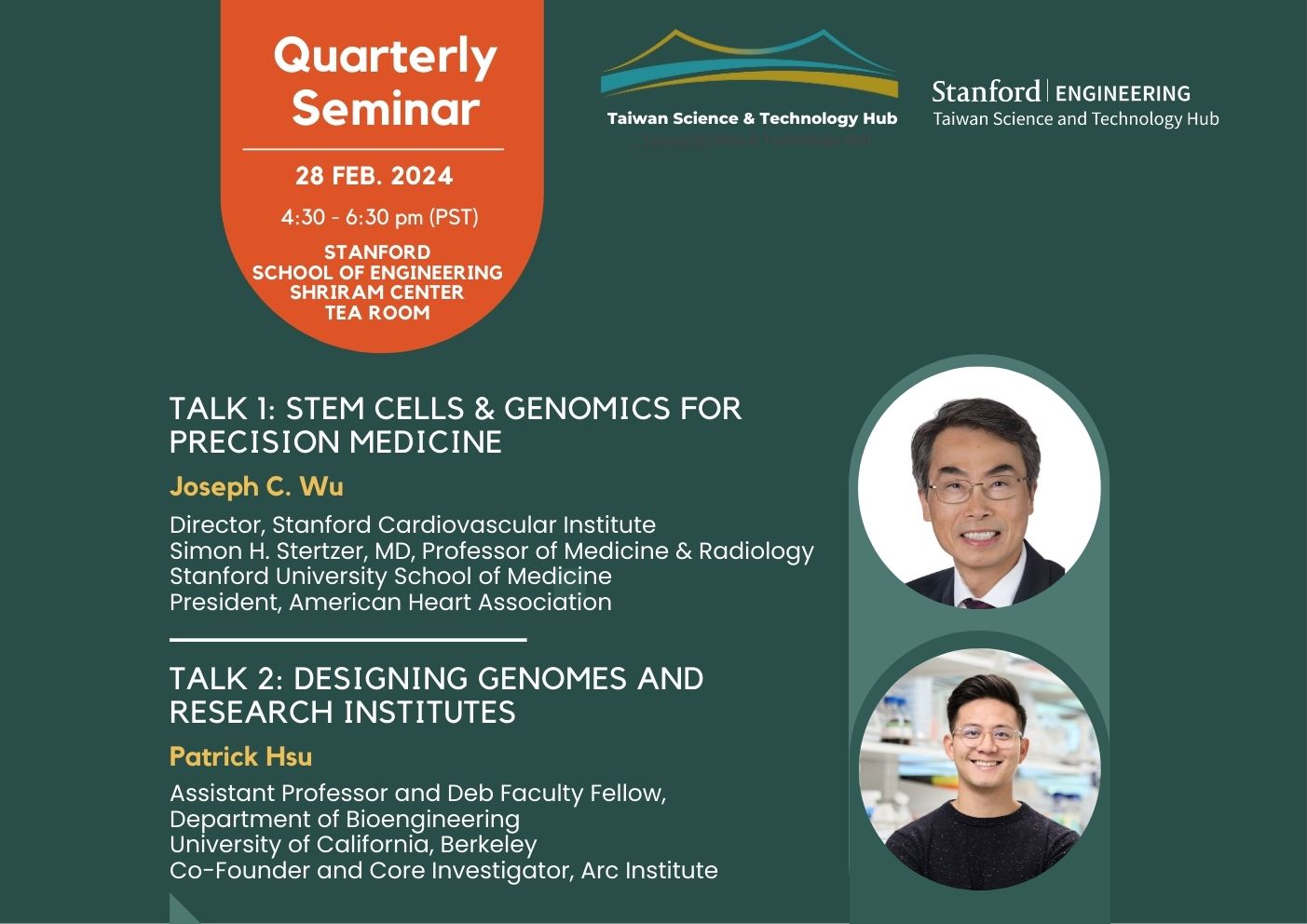 第一季論壇將在台灣時間2月29日上午8點30分準時與Stanford連線.我們邀請到Joseph C. Wu及Patrick Hsu兩位充滿傳奇的講者來為我們的第一場論壇揭開序幕。
