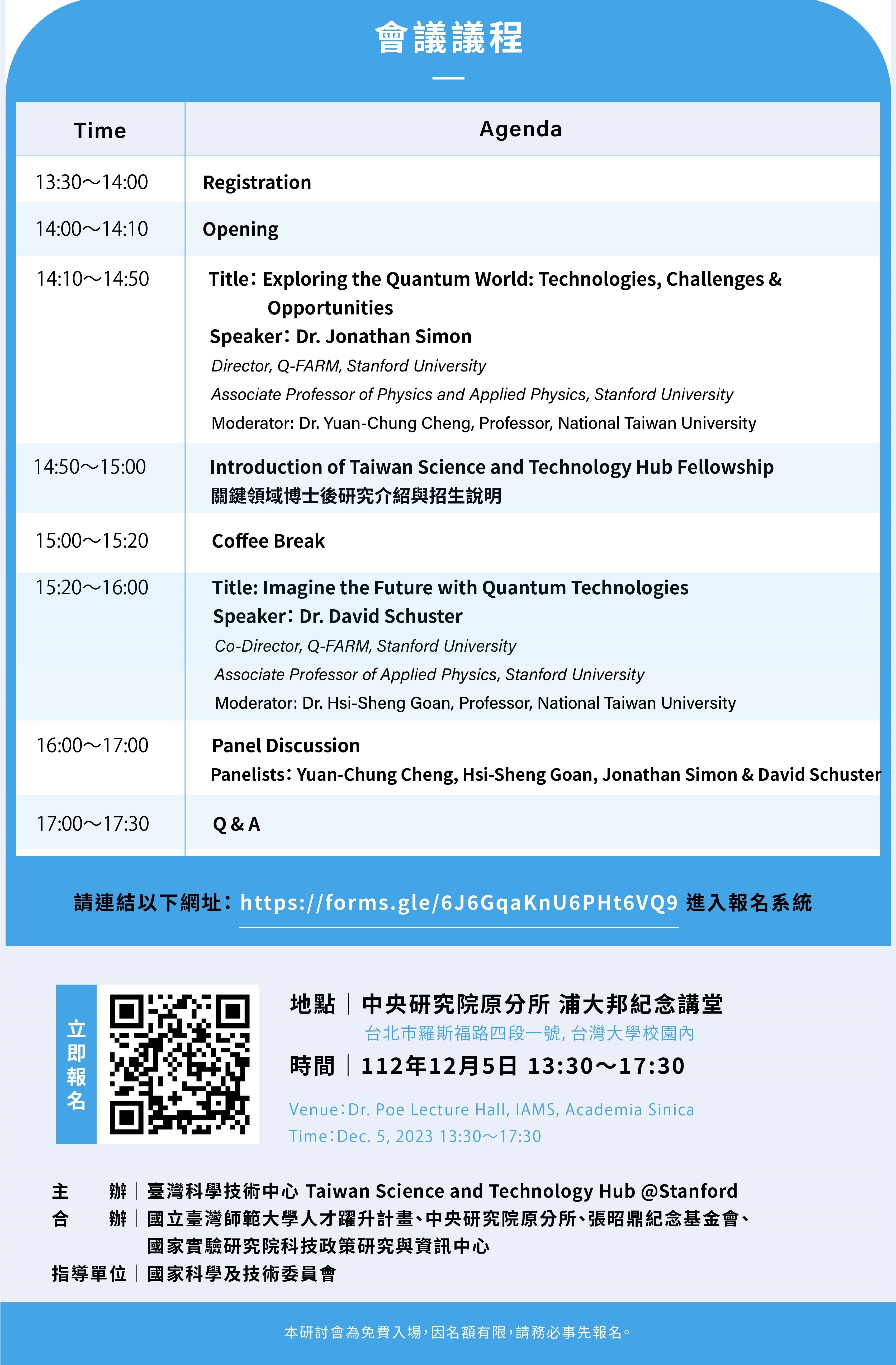 本次論壇特邀請到史丹福大學 Q-FARM 2位大師Dr. Jonathan Simon和Dr. David Schuster蒞臨介紹有關量子科技目前世界上發展之現況,