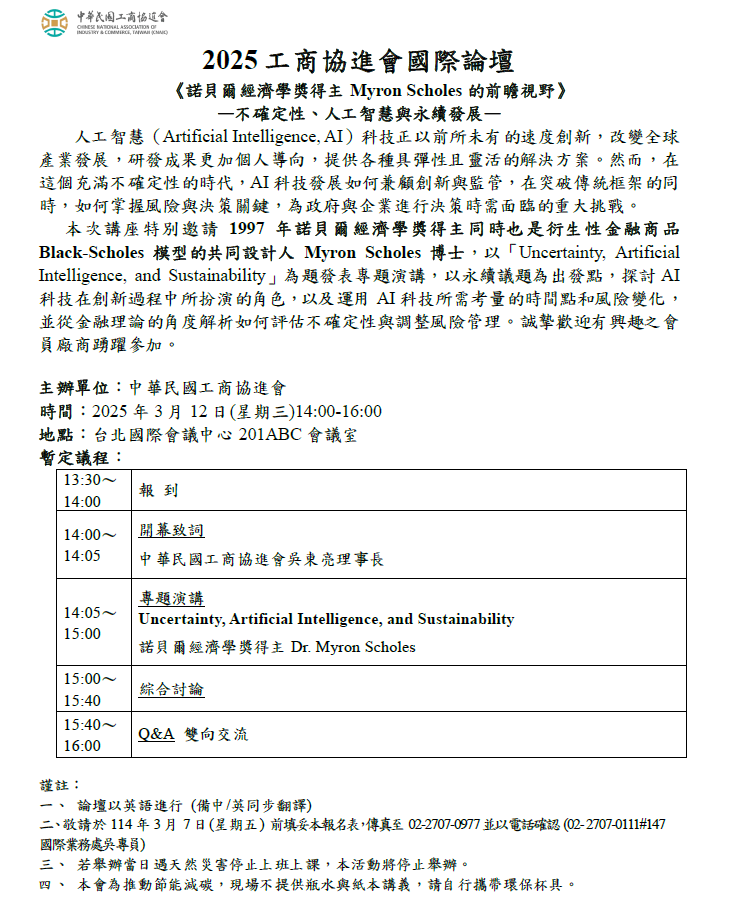 國立臺灣師範大學、中華民國工商協進會、Taiwan Science and Technology Hub@Stanford 共同邀請1997年諾貝爾經濟學獎得主、史丹佛大學商學院麥倫·舒爾茲(Myron Scholes)榮譽教授,3月11日和12日親臨分享,探討「不確定性、人工智慧與永續發展(Uncertainty, Artificial Intelligence, and Sustainability)」,誠摯邀請產學界菁英,共同參與本次重量級專題講座。。